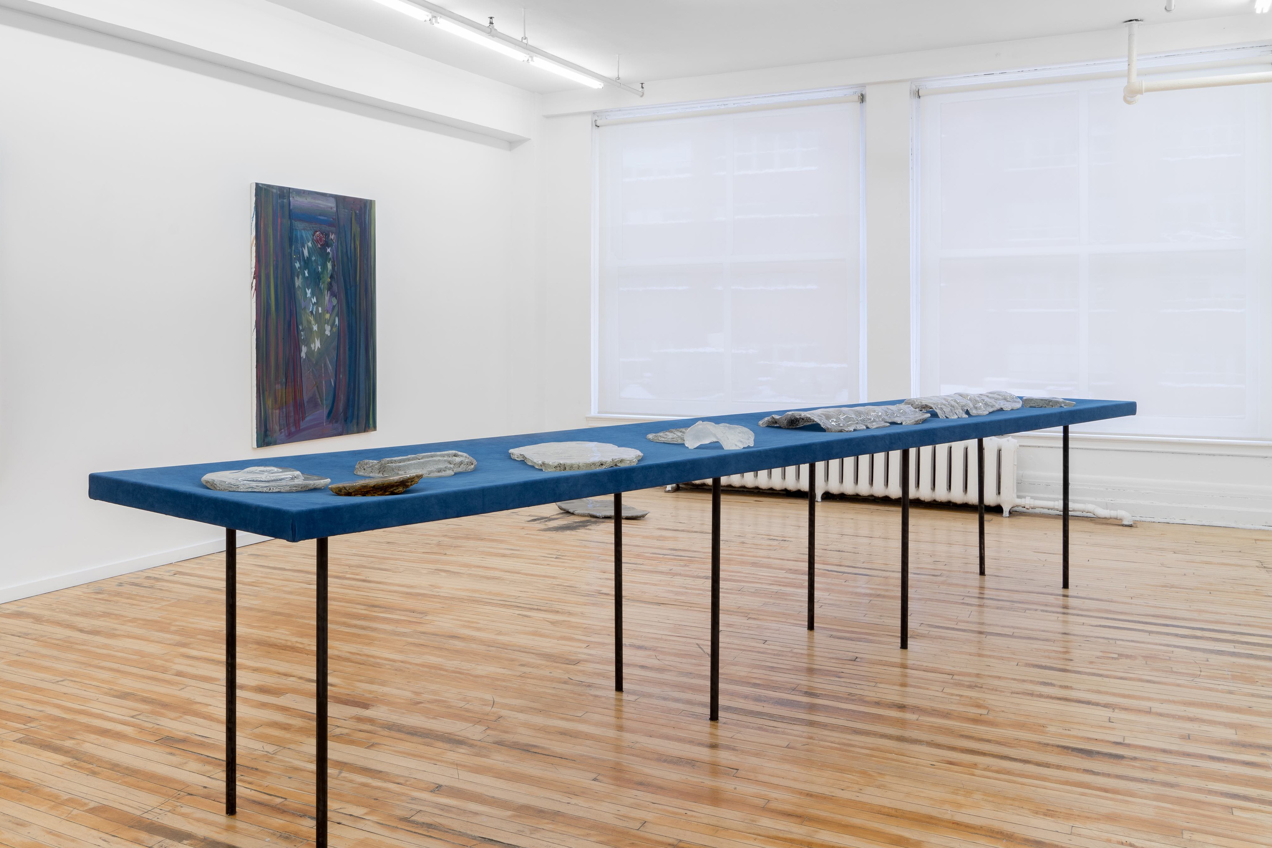 Dispositif de présentation | Table : coton teint à la main à partir d’indigo japonais, bois, acier | hand-dyed coton with indigo leaves, wood, steel.